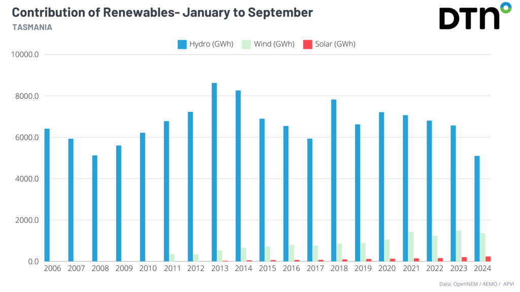 You can see in the graph below that most of the renewable contribution came from hydropower, with wind power contribution increasing from 2013 after Mussleroe Wind Farm was installed. Solar power has steadily grown in Tasmania over the last decade and wind power peaked last year.