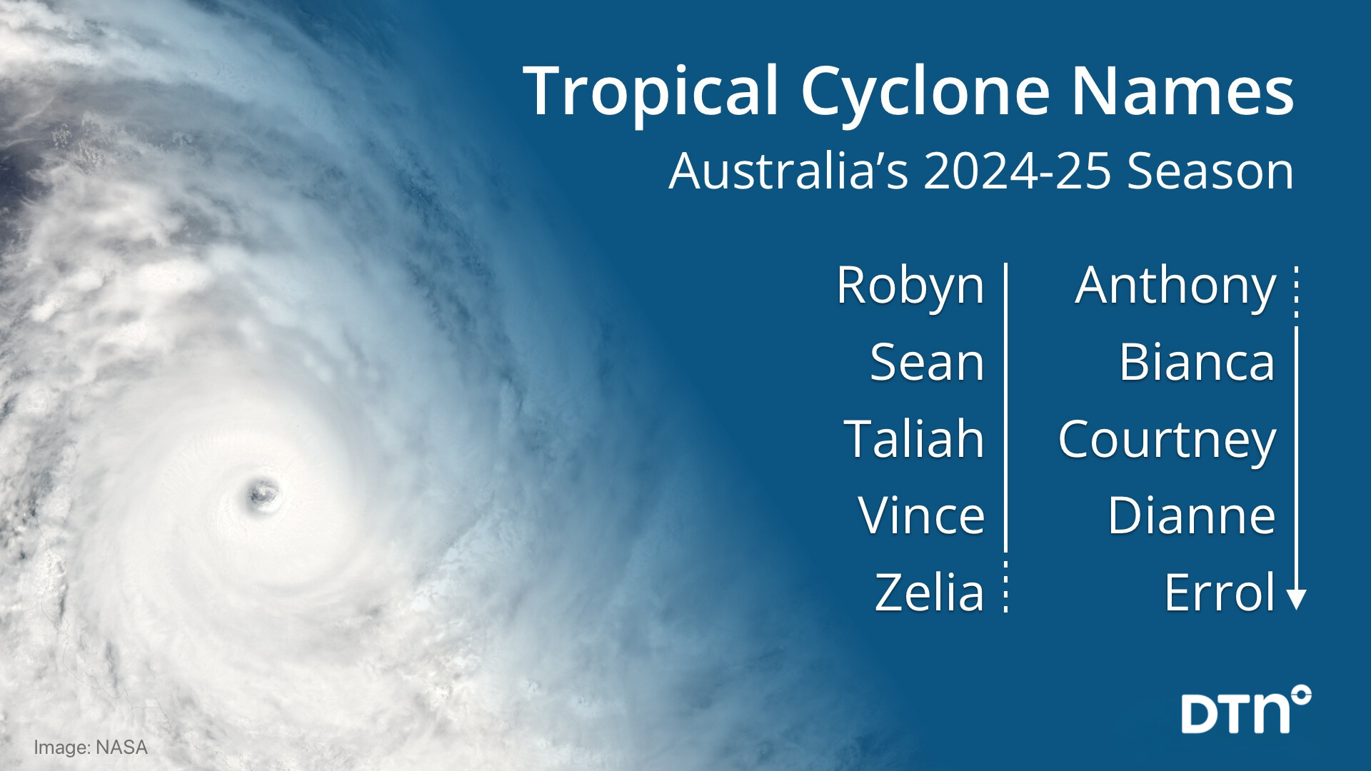 The first tropical cyclone to form in Australia’s area of responsibility this season will be named Robyn, followed by Sean, Taliah and Vince. Below are the names that will be assigned to the next 10 tropical cyclones that form in Australia’s region.
